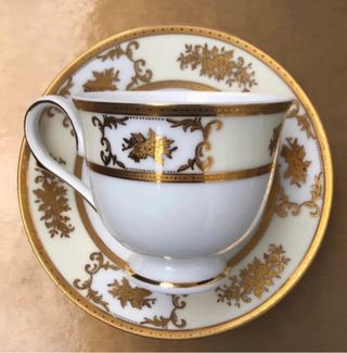 Elegante servizio da tè Limoges, perfetto per occasioni speciali. Realizzato in porcellana di alta qualità con finiture dorate. - Design classico con decorazioni floreali dorate. - Bordo e manico rifiniti in oro. - Include tazza e piattino.