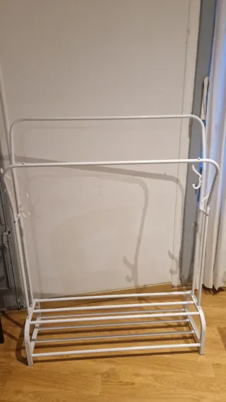 Appendiabiti pratico con doppia barra superiore e ripiani inferiori per organizzare vestiti e scarpe. Montaggio facile. Se mi avverti in anticipo, posso smontarlo per un trasporto migliore. Struttura metallica. Design a doppia barra. Ripiani multipli per scarpe. Ganci laterali per appendere.