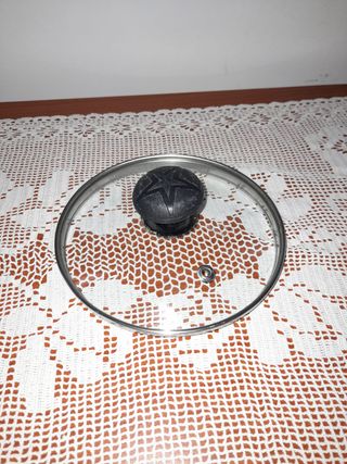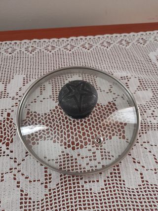 Il coperchio è nuovo e in vendita per mancato utilizzo: è perfettamente funzionante e ottimo per la sua funzione. Il vetro è integro, senza crepi o strisce profonde. Il coperchio è in vetro temperato trasparente con bordo in acciaio inox. È di colore trasparente e grigio acciaio, al tatto lucido e può essere facilmente lavato in lavastoviglie. Esso può essere usato su qualsiasi pentola o padella di diametro corrispondente (utilizzabile su piani a induzione, vetroceramica, elettrico e gas) ed ha un pratico pomolo nero con decoro a stella per essere sollevato in sicurezza. È dotato di una valvola metallica per lo sfiato del vapore. Es