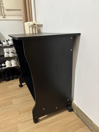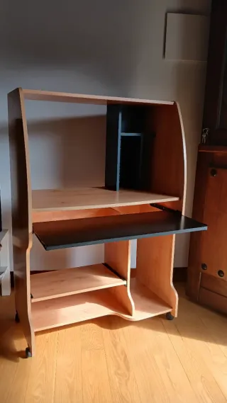 Scrivania compatta pratica, ideale per spazi ridotti. Il suo design funzionale la rende molto versatile. Alcuni usi e leggermente usurato. Struttura in legno con finitura marrone. Include ruote per facilitare la mobilità. Dispone di vari livelli di archiviazione.