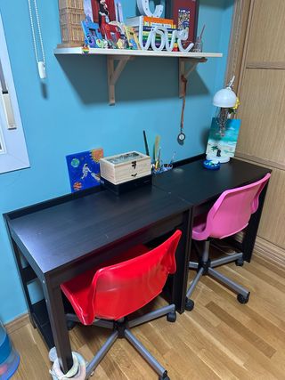 2 scrivanie nere e 2 sedie (rossa e rosa)