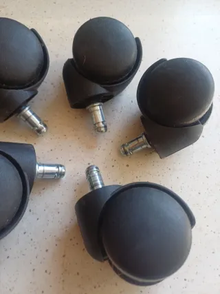 Confezione di cinque ruote di ricambio per sedie da scrivania. Ideali per sostituire le ruote usurate e ripristinare la mobilità della tua sedia. Realizzate in plastica e metallo, colore nero.