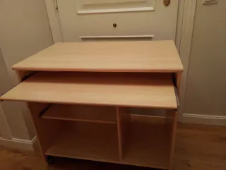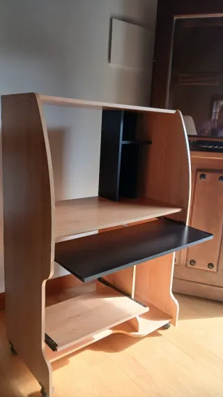 Tavolo per computer con design estensibile e ruote per facilitarne la mobilità. Si trova in buone condizioni. Struttura in legno. Finitura in tonalità beige e marrone.