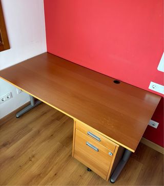 Scrivania con design moderno e funzionale. Misure: 140 cm di larghezza x 53 cm di profondità. Molto robusta. Cassettiera con ruote opzionale a 30 euro. Finitura in tonalità di legno chiaro e beige. Ampia superficie per lavorare o studiare. Piccole segni d'uso sulla scrivania visibili nelle foto. La cassettiera è impeccabile. La scrivania viene consegnata smontata per facilitare il trasporto. Ascensore e facilità di parcheggio alla porta.