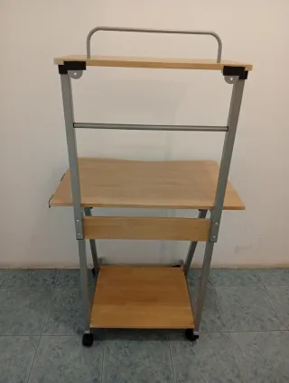 Pratica scrivania a due livelli con ruote per facilitarne la mobilità. Struttura in metallo. Superfici in legno. Ruote per lo spostamento.