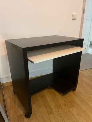 Tavolo da scrivania o per computer, pratico e funzionale. - Vassoio estraibile per tastiera - Ruote per facilitare la mobilità - Superficie con alcuni segni di usura - Design moderno e versatile - Presenta difetti che non influiscono sull'uso e possono essere esteticamente coperti con un tappetino come il mio.