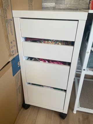 Pratico cassettone per organizzare la scrivania o lo spazio di lavoro. Le ruote ne facilitano la mobilità. Design a quattro cassetti. Finitura liscia e opaca. L'unico "difetto" sono i ganci inchiodati su un lato. Per il resto, è perfetto. Dimensioni: 75,5x35,5x50,5.