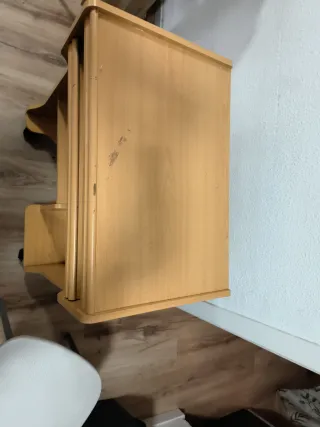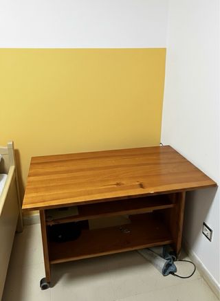 Vendo tavolo da scrivania in legno di pino, molto pratico e robusto. Perfetto per studiare o lavorare. Misure: 100 cm (larghezza) x 60 cm (profondità) x 74 cm (altezza). Design funzionale: ripiano superiore aperto (senza fondo), ideale per accedere facilmente o lasciare spazio per le gambe. Ripiano inferiore con pannello posteriore che include un foro per i cavi per mantenere la torre del PC o i caricatori organizzati. Mobilità: dotato di ruote. Stato: presenta qualche piccola scalfittura dovuta all'uso normale nella parte superiore.