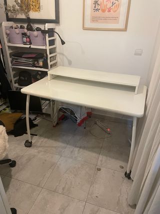 Scrivania dal design moderno con una superficie ampia e gambe con ruote. Misure: 100x60 cm. Gambe con ruote per facile mobilità. Struttura metallica. Le ruote possono essere bloccate o rimosse. Da ritirare a Boadilla del Monte, Madrid.