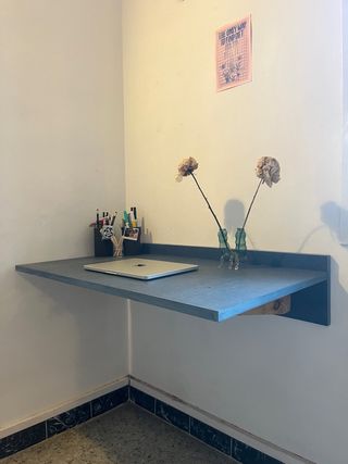 Scrivania realizzata a mano, con piano in valchromat blu e supporti in legno massello. Si fissa alla parete con 4 viti, installazione molto facile! Ideale per piccoli spazi poiché sembra 'galleggiare' e occupa poco spazio visivo.