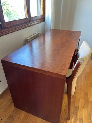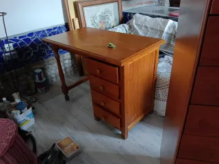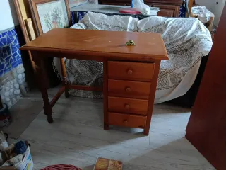 Bellissimo scrivania in legno massello con un design classico e funzionale. Struttura robusta in legno. Persiana avvolgibile per nascondere l'area di lavoro. Cassetti con maniglie metalliche. Possibilità di levigare e verniciare in un colore diverso essendo in legno massello. Ho uno specchio abbinato per utilizzare l'intero set come mobile d'ingresso.
