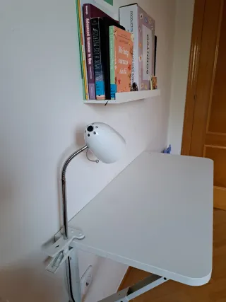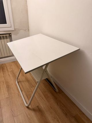 Scrivania bianca con superficie in legno, ideale per spazi ridotti. Dotata di supporti metallici pieghevoli per facilitarne l'archiviazione. - Superficie bianca. - Struttura in legno. - Supporti metallici pieghevoli.