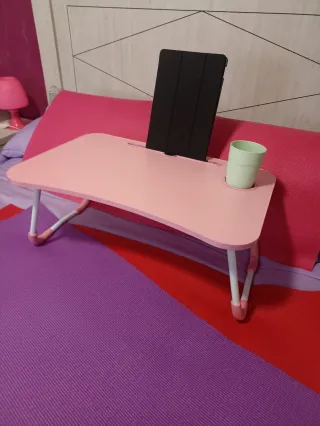 Tavolo ausiliario pieghevole pratico, ideale da usare sul letto o sul divano. Il suo design compatto lo rende facile da riporre. - Superficie rosa. - Gambe pieghevoli per maggiore comodità. - Include supporto per tablet e portabicchiere. - Ideale per i tuoi colazioni del fine settimana. - Scanalatura per tablet e cellulare. - Posacenere incorporato. - Gambe pieghevoli. - Materiali di qualità.