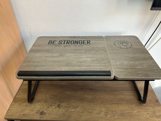 Pratica scrivania portatile con un design ispiratore e funzionale. Superficie in legno con finitura in imitazione legno. Gambe metalliche pieghevoli per un facile stoccaggio. Dettaglio di testo motivazionale 'BE STRONGER'. Simbolo di pugno chiuso in cerchio.