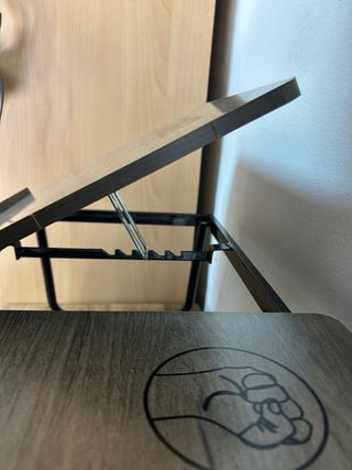 Tavolo nero portatile pieghevole, perfetto per lavorare con il portatile, guardare serie o leggere sul divano o sul letto. Superficie nera ampia + tavoli indipendenti (come si vede nelle foto) per l'elevazione del più grande (si adatta a diverse altezze). Gambe metalliche regolabili pieghevoli che si adattano a diverse altezze. Buono stato generale: senza danni importanti, solo segni di uso normale. La sua struttura permette un facile stoccaggio. Misure approssimative: 60x35x25 (minimo).