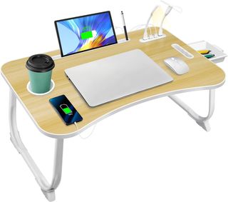 Pratica scrivania pieghevole in legno, perfetta da usare sul divano o sul letto. Il suo design permette di adattarla a diverse altezze e angoli. Realizzata in bambù e legno, con superficie con fori per la ventilazione. Gambe pieghevoli per un facile stoccaggio e regolabili a diverse altezze. Cassetto laterale per il deposito.