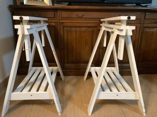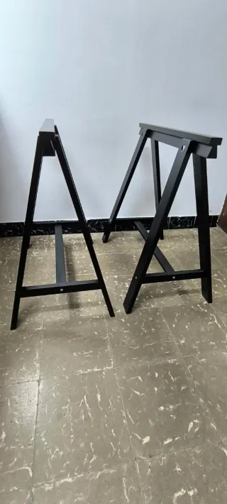 Coppia di cavalletti in legno di colore nero. Ideali per montare una scrivania o un tavolo da lavoro. In ottime condizioni. Hanno una struttura robusta e stabile. Non sono pieghevoli, li ho montati. Se li ritirate a mano e montati, li lascio a 8€ per entrambi. Altrimenti, li smonterò e cambierò il prezzo. Non li trovano più da Ikea, ma il loro prezzo originale era di 15€ ciascuno.