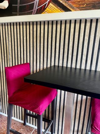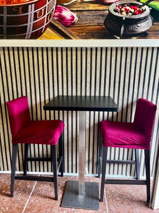 Bellissimo set composto da un tavolo quadrato e due sgabelli alti. Perfetti per un piccolo spazio. - Piano tavolo nero. - Struttura in metallo. - Rivestimento sedie color borgogna.