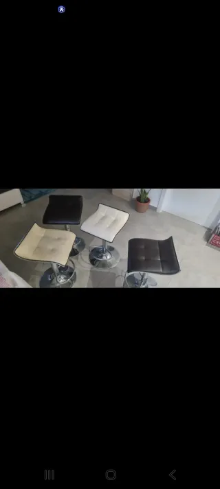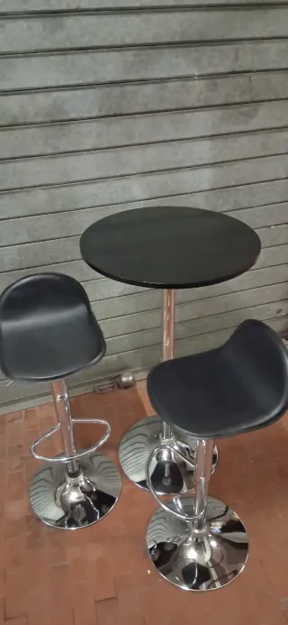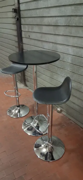40€ 2 sgabelli 50€ tavolo Set composto da un tavolo alto rotondo e due sgabelli da bar. - Tavolo con piano nero e base cromata. - Sgabelli con seduta nera e base cromata. - Altezza degli sgabelli regolabile.