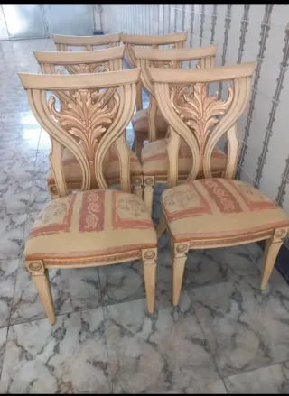Elegante set di sei sedie con un design classico e raffinato. Sono in ottime condizioni, non esitate a chiedere. - Rivestimento in tessuto con dettagli beige e tocchi dorati. - Struttura in legno robusta. - Schienale decorato con dettagli dorati.