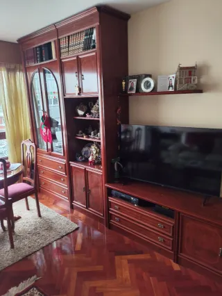 Mobile in legno con due vetrine, mobile TV, tavolo da pranzo allungabile con 6 sedie imbottite.