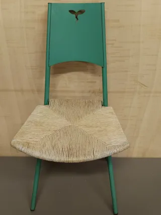 Set di 4 sedie pieghevoli modello Mia di Giorgio Cattelan ; struttura in acciaio verniciato silver, seduta in legno rivestita in paglia di carta. Sono in buone condizioni, mostrano segni di usura sul rivestimento in paglua di carta delle sedute; qualche graffio sulla vernice. Altezza seduta cm 46, larghezza seduta cm 40 Consegna a mano a La Spezia