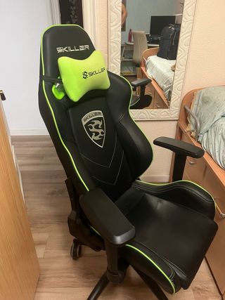 Sedia da gaming SKILLER con un design moderno ed ergonomico. - Rivestimento nero con dettagli in verde lime. - Poggiatesta e supporto lombare inclusi. - Logo SKILLER sul retro e sul poggiatesta.