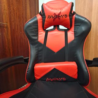 Sedia da gaming in ottime condizioni, quasi nuova. Combina pelle sintetica e dettagli in rosso e nero per un look moderno. Design ergonomico. Cuscino lombare incluso. Base girevole con ruote.