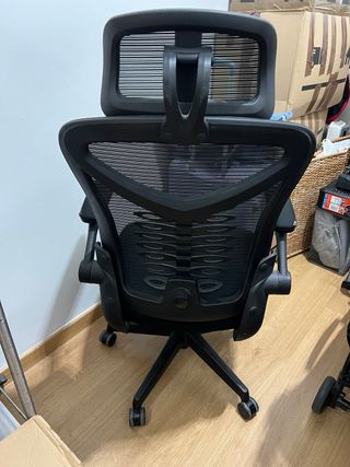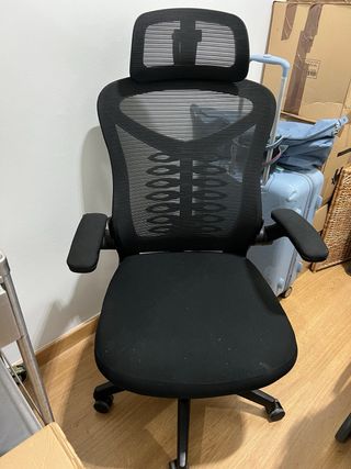 Sedia da scrivania con design ergonomico, ideale per lunghe giornate di lavoro o studio. Il suo schienale in rete permette una buona ventilazione. - Schienale in rete traspirante. - Poggiatesta regolabile. - Braccioli imbottiti. - Base con ruote per facile mobilità. - Curva a forma di S. - Supporto lombare regolabile 3 cm. - Può reclinare fino a 125 gradi. Presenta un difetto in uno dei braccioli come visibile nell'immagine.