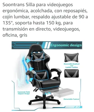 Sedia ergonomica imbottita per videogiochi e ufficio, con design moderno. - Schienale regolabile da 90 a 135 gradi. - Supporta fino a 150 kg. - Include poggiapiedi retrattile. - Cuscino lombare e poggiatesta rimovibili.