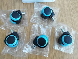Ruote girevoli universali per sedia da ufficio o gaming. Progettate per un'esperienza di scorrimento silenziosa e fluida. Rivestimento in gomma color turchese per evitare graffi sul pavimento. Compatibili con la maggior parte delle basi di sedie con fori di montaggio standard. Dotate di un albero metallico per l'inserimento nella base della sedia. Le ruote mostrate nell'ultima foto sono nuove, sostituite da altre di colore nero.