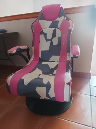 Sedia da gaming X Rocker con un design accattivante in rosa e camo. Rivestimento in tessuto e similpelle combinati. Base girevole nera.