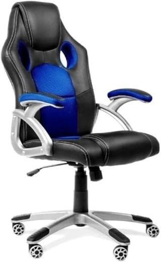 Sedia da scrivania con un design sportivo ed ergonomico, ideale per lunghe sessioni. Finitura in pelle sintetica. Dettagli in blu. Include cuscini per la testa e la zona lombare. Base con ruote per una facile mobilità.