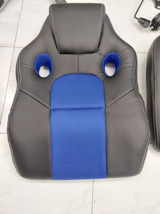 Sedia da gaming dallo stile moderno e confortevole. Rivestimento in pelle sintetica. Dettagli in blu. Mancano un paio di viti.