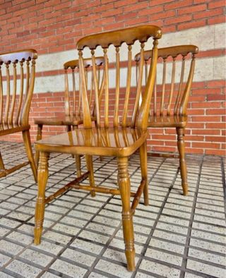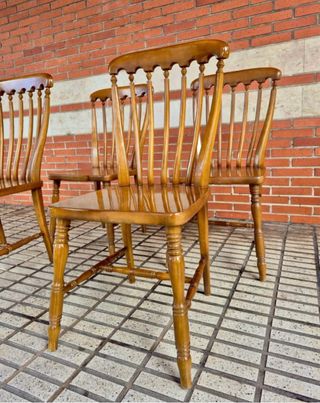 CONSEGNA DI DUE SEDIE Set di quattro sedie in stile Windsor, realizzate in legno massello. Sedie robuste, pratiche e resistenti, color miele, con lievi segni d'uso ma funzionali e utili. Schienale alto e avvolgente, gambe tornite e caratteristiche dello stile inglese Windsor. Altezza 92 Larghezza 42 Profondità 40. Spedizione: 2 🪑 in ogni 📦.