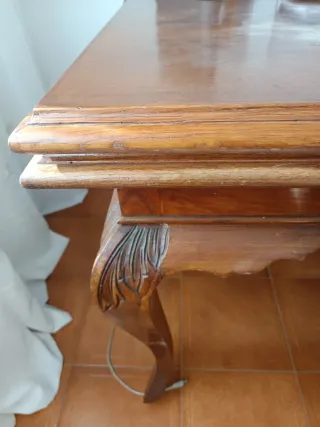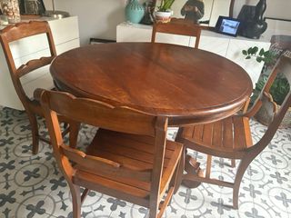 Tavolo elegante in legno massello con design classico. Perfetto per aggiungere un tocco di calore al tuo salotto. Quando il tavolo si apre, diventa un tavolo per la famiglia (circa 12 persone). Include 6 sedie abbinate. Finitura in tonalità marrone scuro. Misure su richiesta. Prezzo negoziabile.