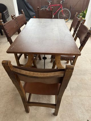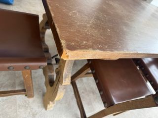 Il tavolo ha il piano da riparare. Il resto del tavolo è in legno massello e necessita solo di verniciatura. Le sedie sono in buone condizioni. - Struttura in legno robusta. - Sedili e schienali rivestiti in pelle. • Tavolo da pranzo in stile rustico • Struttura e gambe in legno massello • Piano in truciolato • 6 sedie in legno massello • Sedili e schienali in vero cuoio con borchie • Molto solido e stabile • Uso normale, senza rotture