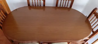 Tavolo da pranzo elegante con design classico, in ottime condizioni. Dimensioni chiuso: 166 cm di lunghezza, 90 cm di larghezza e 77 cm di altezza. Esteso: 240 cm di lunghezza. Set di sei sedie in legno massello, in ottimo stato, senza giochi. IN OMAGGIO comodino marrone.