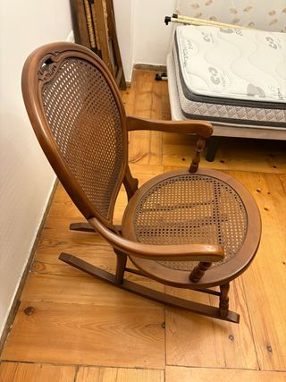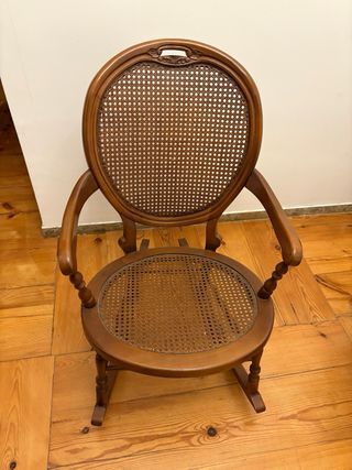 Vecchia sedia a dondolo con sedile in giuta intrecciata. Il suo design classico la rende un mobile decorativo e funzionale. In perfette condizioni d'uso, supporta il peso di un adulto. Tocco vintage per qualsiasi ambiente, con i suoi leggeri segni del tempo che le conferiscono personalità. Struttura in legno massello. Finitura color crema con dettagli floreali dipinti a mano. Senza parti staccate o tarlo.