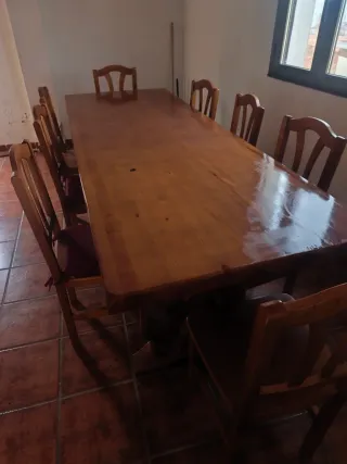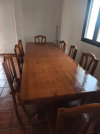 Ofrezco esta elegante mesa de merendero de madera maciza, con un largo aproximado de 3 metros y ancho de 1 metro, ideal para reuniones familiares o eventos. Incluye 8 sillas a juego todas en perfecto estado y con acabados barnizados impecables para mayor durabilidad y brillo. Diseno rustico y solido, lista para usar. Precio negociable Contacte para mas informacion, con disponibilidad para hacerle el porte donde quiera, se la llevamos. SE DISPONE DE OTRA MESA DEL ESTILO PERO CON DIFERENTE ACABADO EN PERFECTO ESTADO. Contacte ✌️