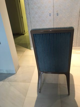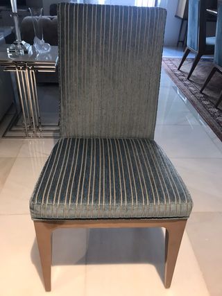 8 eleganti sedie da pranzo con un design moderno e confortevole, della prestigiosa azienda artigianale AMBOAN. - Imbottitura di alta qualità con sottili strisce dorate su sfondo blu-grigio. - Gambe in legno massello molto resistenti. Prezzo per unità. Misure del prodotto da verificare.