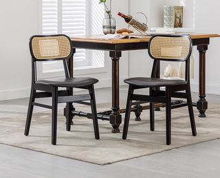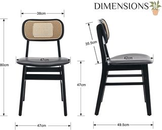 Confezione di 2 sedie da pranzo Chairus, realizzate in legno massello con schienale in rattan intrecciato e sedile in similpelle nera. Dimensioni: 47 x 49,5 x 80 cm, sedile 47 x 42 cm, schienale 38 cm, altezza sedile 47 cm. Peso: 11,1 kg ciascuna. Portano fino a 113 kg. Design vintage con tocco rustico, schienale ergonomico e sedile morbido facile da pulire. Stato nuovo, assemblaggio semplice. Ideali per sala da pranzo, soggiorno o caffetteria, sono resistenti.
