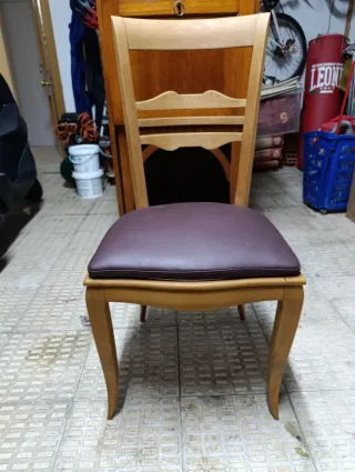 Set di sedie da pranzo con struttura in legno massello e sedile imbottito. Stile classico contemporaneo/neoclásico. Ispirazione anni '80-'90. Gambe ricurve. Schienale con traversi ondulati. Sedile imbottito in bordeaux. Design classico ed elegante.