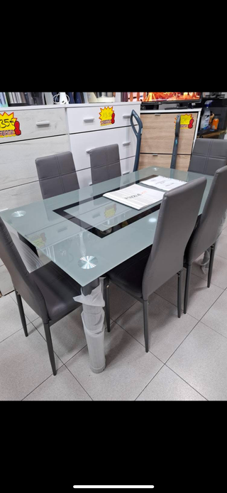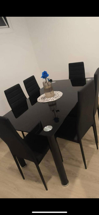 Set elegante di tavolo da pranzo con superficie in vetro nero e sedie imbottite. Tavolo con gambe metalliche e dettagli argentati. Sedie con rivestimento in similpelle.
