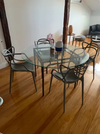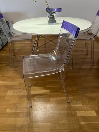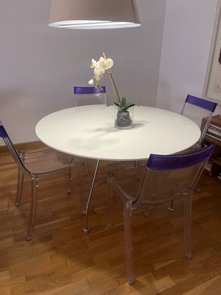 Set di tavolo rotondo modello "Glossy Oval" e quattro sedie di design del marchio Kartell. Tavolo per 8 persone. L'intero set è costato 3500€. - Tavolo con piano bianco e gambe in metallo. - Sedie trasparenti con dettagli in viola. Non si effettuano spedizioni né vendite separate. Si ritirerà a Murcia città. Astenersi offerte. Vedi le mie valutazioni