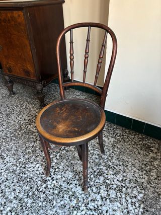 Sedia in legno tipo Thonet. Ideale per qualsiasi spazio a cui si vuole dare un tocco antico. Misure approssimative: 79 cm di altezza, curva dello schienale 53 cm, sedile 39 cm di larghezza. Struttura curva caratteristica. Sedile rotondo. Gambe robuste. Circa 60-65 anni. Ritiro a domicilio.