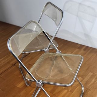Coppia di sedie originali PLIA di Giancarlo Piretti, marchiate e vintage dagli anni '70. Presentata nel 1967 alla Fiera del Mobile di Milano, la PLIA ha rivoluzionato il concetto di sedia pieghevole con il suo innovativo "perno a 3 dischi". Realizzata con acciaio e polipropilene, è diventata un'icona del design democratico e è esposta al MoMA di New York. Le sedie ottennero grande successo, tanto che alcuni visitatori le portarono via senza autorizzazione, rendendo necessario legarle con una catena. Piretti è stato soprannominato il "Thonet del 20° secolo" Misure: altezza 75 cm, larghezza 46 cm, profondità 50 cm (5 cm quando chiusa)