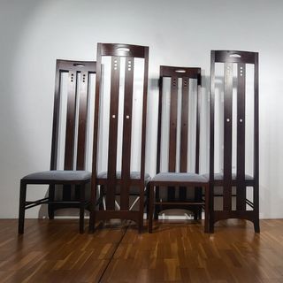 4 Sedie Modello ingram high disegnate da CHARLES rennie MACKINTOSH by CASSINA. ORIGINALI, FIRMATE e TIMBRATE. Tessuto e legno noce canaletto. misure SINGOLA SEDIA h 150,5 x 47 x P 44,5 cm circa (peso 20 kg). Seguici sulle nostre pagine social:@alexdesignmilano. Vintage Epoca anni 80’.