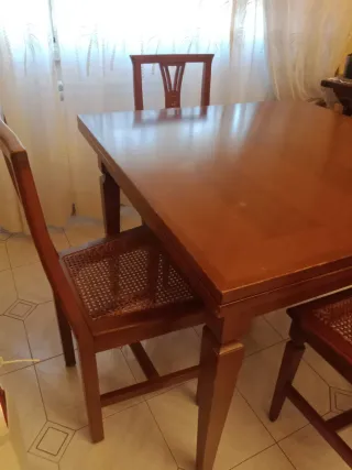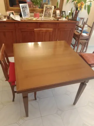 tavolo antico legno noce allungabile con 6 sedie, tutto originale dei primi anni del '900. Il tavolo si può allungare, in quanto sono presenti delle staffe in ferro per poggiare eventuali estensioni. Non ci sono estensioni di legno in vendita. Le sedie sono state appena rifoderate. Dimensioni tavolo non allungato: 120x110x80 con le estensioni arriva a 190 dimensioni sedie: 98x43x33 Ritiro a Roma in zona Montagnola, secondo piano con ascensore