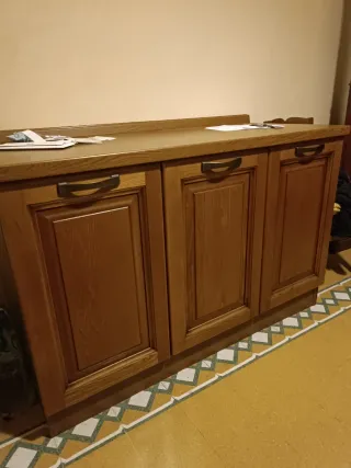 Cucina lineare in rovere, lunga 2,10 metri. Include una lavastoviglie, forno, tavolo con dei sedie - Ante con maniglie. - Top in okite, lavello in fragranite